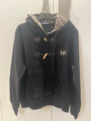 Felpa nera con cappuccio, perfetta per un look casual. - Chiusura con alamari in legno e similpelle. - Fodera interna del cappuccio con stampa animalier. - Tasca frontale a marsupio. - Applicazione a forma di cuore con strass e fiocco sul petto.