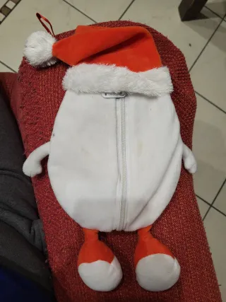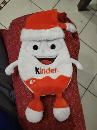 Pupazzo a tema natalizio del marchio Kinder. Perfetto per un regalo o per decorare. - Design a forma di uovo Kinder. - Indossa un cappello da Babbo Natale. - Logo Kinder stampato sul davanti.
