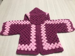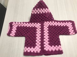 Golfino fatto a mano all'uncinetto per bambina, perfetto per le giornate più fresche. - Colore viola con dettagli rosa. - Modello con cappuccio. - Realizzato con filato morbido.