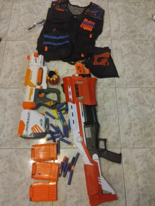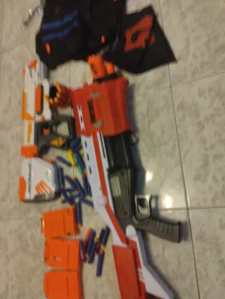 Set di fucili Nerf Fortnite con accessori assortiti. - Fucile Nerf Fortnite grande arancione e bianco. - Fucile Nerf Modulus bianco e arancione. - Gilet tattico nero con tasche. - Caricatori aggiuntivi. - Dardi Nerf di vari colori. Occhiali di protezione
