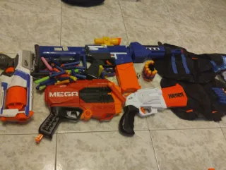 Set di pistole e fucili Nerf con accessori. - Fucile blu e arancione con mirino giallo. - Pistola rossa MEGA. - Pistola bianca e arancione Fortnite. - Dardi colorati inclusi. Gilet e occhiali di protezione