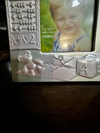 Cornice portafoto decorata con tema infantile, ideale per conservare i ricordi più belli. - Design con abaco, calcoli e orsetto. - Spazio per foto 6cm x 6cm. - Marca: Marco Polo.