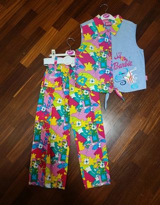 Completo Barbie multicolore ragazza 12 anni, 100% cotone sia top che pantalone. Pantalone fantasia multicolore con cintura bianca e top smanicato con bottoni e nodo in vita con stessa fantasia del pantalone e tessuto simile jeans. Nuovo con cartellino. Prezzo reale di acquisto 74.9 euro