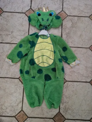 Costume da principe ranocchio per bambini, ideale per feste di carnevale o recite. - Tuta intera verde con macchie. - Dettagli dorati sul petto. - Cappuccio a forma di testa di ranocchio con corona.