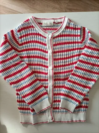 Praticamente nuovi! 1 azzurro con filo lurex OVS 1 traforato bianco,azzurro, rosa, rosso. Ovs 1 color panna con ricamo fiori e pom-pom, molto caldo. Il tessuto ha un effetto lanoso, ma è proprio fatto così. È una taglia 3-4 ma veste grande 4-5. #cardigan #golfini #bambina