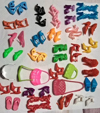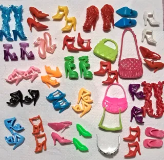 Set di accessori per bambole, include 10 borsette e 10 paia di scarpe. Diverse tra loro - Borsette di vari colori: rosa, blu, giallo, verde, viola e argento. - Scarpe di vari colori: rosa, blu, rosse e gialle. - Alcuni accessori sono a forma di fiore o frutta. Tutti mai usati
