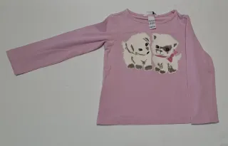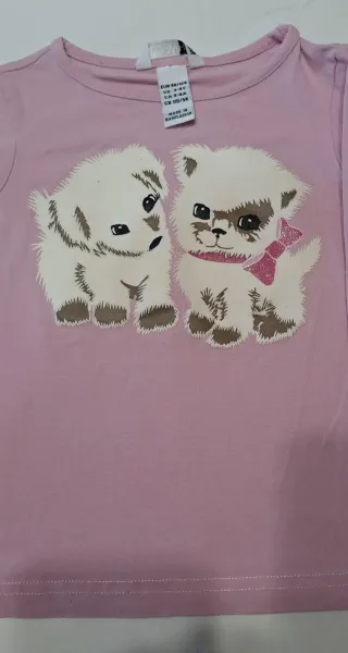 Maglietta a maniche lunghe per bambina, taglia 3-4 anni. - Colore rosa pastello. - Stampa di due cuccioli sul davanti. - Collo rotondo.
