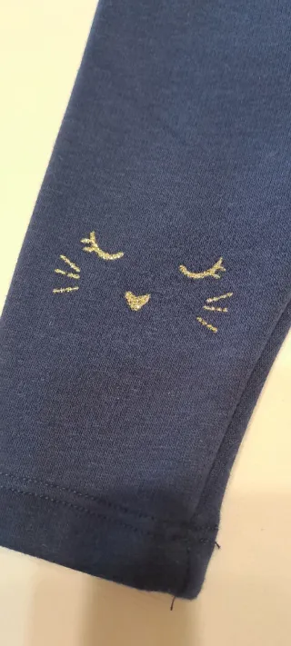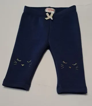 Pantaloni morbidi e comodi per neonata. Taglia 3 mesi, 59 cm. - Colore blu scuro. - Decorazione con musetto di gatto dorato sulle ginocchia. - Elastico in vita con fiocco decorativo.