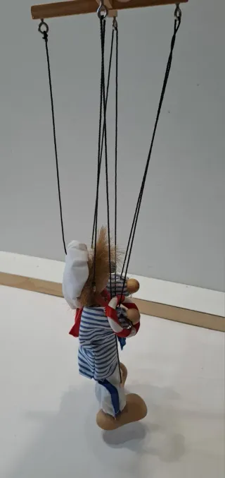 Marionetta marinaio da collezione con dettagli curati, realizzata con legno e tessuto. Altezza compresa di fili 30 cm Altezza solo marionetta 15,5 cm
