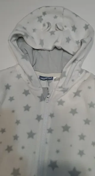 Calda tuta intera in pile per bambino, ideale per le giornate più fredde. 8-10 anni - Fantasia con stelle grigie su sfondo bianco. - Chiusura con zip frontale. - Cappuccio con orecchie.
