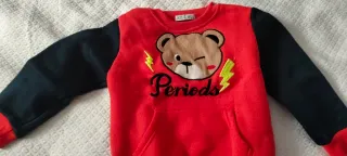 Maglietta a maniche lunghe per bambino, con un simpatico orsetto sul davanti. - Colore principale rosso con maniche blu. - Applicazione di un orsetto con dettagli ricamati. - Scritta Periods in corsivo nero. - Tasca frontale a marsupio.