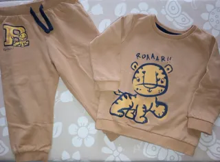 Set di abbigliamento per bambino con simpatico disegno di tigre. - Pantalone beige con stampa R e tigre. - Maglia beige con stampa ROAAAR!! e tigre. - Maglia e pantalone blu scuro con stampa di tigri e lettere R.