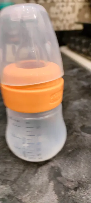 Biberon Chicco per neonati. - Colore trasparente e arancione. - Tappo protettivo trasparente. Biberon per far bere piccole quantità esempio acqua o camomilla. Capienza 50ml