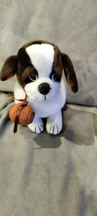 Simpatico peluche a forma di cagnolino San Bernardo, con una piccola botte legata al collo. - Morbido al tatto. - Dettagli curati.