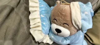 Morbido peluche a forma di orsetto, perfetto per i più piccoli. Il design a tema notturno lo rende un compagno ideale. - Colore azzurro con fantasia di stelle e lune. - Materiale in peluche soffice al tatto. - Cappellino da notte coordinato.