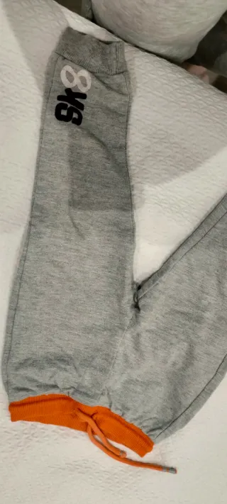 Pantaloni da bambino in morbido tessuto grigio melange. - Vita elasticizzata con laccetti. - Polsini alla caviglia a contrasto colore arancione.