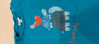Maglietta a maniche corte per neonato con una simpatica stampa di tartarughe. - Colore blu vivace. - Stampa SLOW LIFE sul davanti. - Chiusura con bottoni sulla spalla.