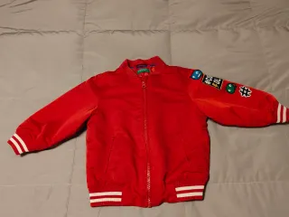 Giubbino Benetton per bambino di colore rosso. Presenta dettagli a contrasto sulle maniche e sui polsini. - Patch decorative sulle maniche - Polsini e fondo a costine con strisce bianche