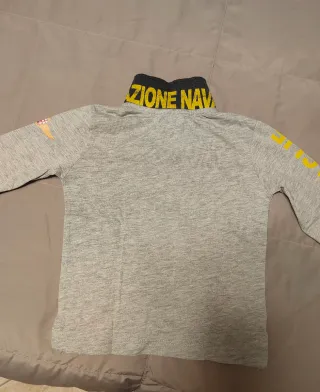 Maglia a maniche lunghe da bambino con colletto. - Colore grigio mélange. - Stampa AVIAZIONE NAVALE sul petto. - Scritta gialla BRUTTA TROLIER sulla manica sinistra. - Dettagli gialli sul colletto e sulla manica destra.