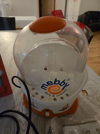 Sterilizzatore per biberon Mebby, ideale per la cura dei più piccoli. Design moderno e funzionale. - Colore bianco e arancione. - Coperchio trasparente. - Base con piedini antiscivolo.