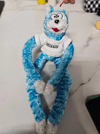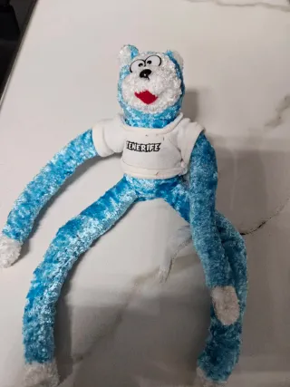 Pupazzo di peluche blu con maglietta bianca. - Maglietta con scritta Tenerife. - Dettagli bianchi su zampe e muso. - Occhi grandi e espressione divertente. Zampe con felcro abbracciami