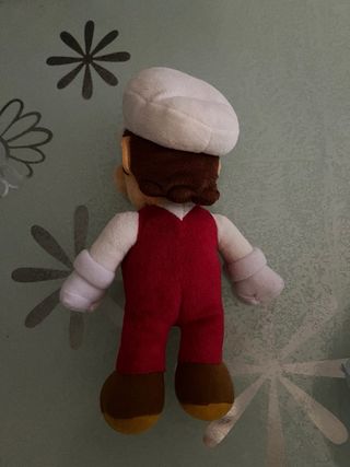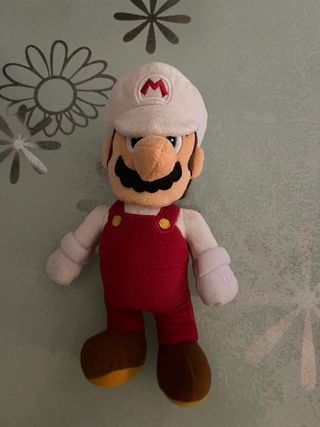 Peluche del personaggio di Super Mario Bros. vestito da Mario Fuoco. - Cappello bianco con logo 'M' rosso. - Salopette rossa con bottoni gialli. - Maniche e guanti bianchi. - Scarpe marroni con suola gialla.