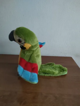 Un simpatico pappagallo di peluche che parla e balla. - Colori vivaci: verde, giallo, blu e rosso. - Morbido al tatto. - Ripetere tutto cuello che si parla. - Misura 21cm di altezza.