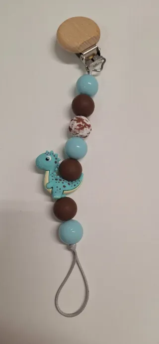 Portaciuccio fatto a mano con simpatico dinosauro azzurro e perline marroni e azzurre. - Clip in legno per agganciare il ciuccio. - Perline colorate in diverse tonalità. - Charm a forma di dinosauro.