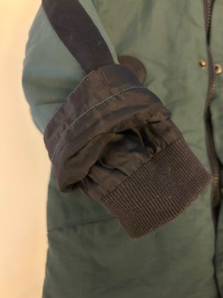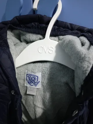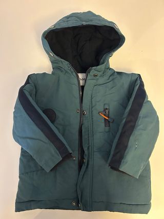 Caldo giubbotto invernale per bambino, taglia 2 anni. Perfetto per le giornate fredde. - Colore verde scuro. - Cappuccio foderato. - Chiusura con zip e bottoni. - Dettagli a contrasto sulle maniche.