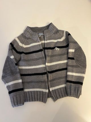 Maglioncino a righe grigie, bianche e nere per bambino. - Girocollo con zip. - Patch sui gomiti. - Logo ricamato sul petto.
