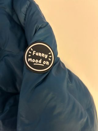 Piumino imbottito con cappuccio, perfetto per i più piccoli. Presenta una stampa ripetuta FUNNY MOOD ON! lungo il bordo del cappuccio e sul fondo. - Colore blu petrolio. - Chiusura con zip frontale. - Tasche laterali con zip. - Patch rotonda Funny mood on sul braccio.