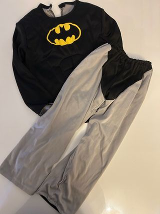 Costume da bambino a tema Batman, ideale per Carnevale o feste in maschera. - Taglia 3-4 anni. - Colore nero con logo Batman giallo sul petto. - Pantaloni grigi e neri.
