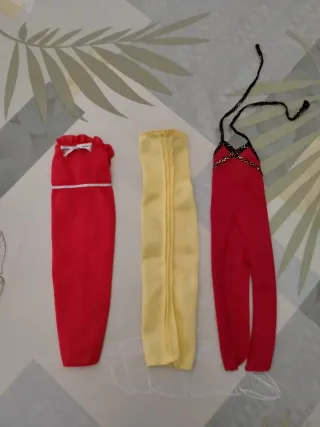 Set di tre abiti da sera vintage per Barbie. Perfetti per ampliare la collezione. Abito rosso con fiocco e dettagli argentati. Abito giallo Abito rosso con spalline nere, purtroppo segnalo un taglio davanti.