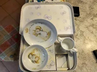 Set colazione Thun composto da piatto, tazza e ciotola, ideale per iniziare la giornata con un tocco di dolcezza. - Piatto con disegno di un angelo che abbraccia una stella. - Ciotola con disegno di un angelo che dorme su una stella. - Tazza con disegno di un angelo e la scritta bello il mio sogno. - Il set è contenuto in una valigetta decorata con fiocchi e stelle.