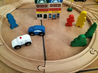 Set completo di villaggio in legno con trenini e accessori per bambini. Ideale per stimolare la creatività e il gioco. 100 pezzi - Include diversi edifici in legno come una chiesa, un ufficio postale e una casa. - Comprende due trenini con vagoni colorati. - Presenti anche macchinine, alberi e segnali stradali in legno. - La pista è componibile in diverse configurazioni.