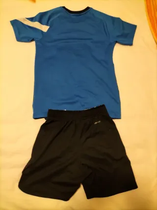 Completo sportivo Nike per bambino, taglia 10-11 anni. Include maglietta e pantaloncini. - Maglietta blu con sfumatura scura e logo Nike bianco. - Pantaloncini neri con grande logo Nike bianco.