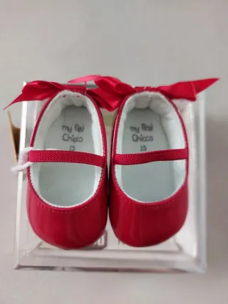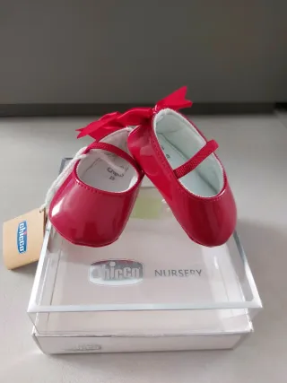Deliziose scarpine modello ballerine per neonata, colore rosso effetto vernice. Solo la scatola è rotta ma le scarpine sono nuove. - Marca: Chicco - Taglia: 15 - Dettaglio fiocco rosso sul retro. - Finitura lucida