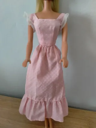 Abito Barbie Sweet Sixteen dell'anno 1973. Un vestito da bambola che evoca un'eleganza senza tempo. Colore rosa pastello. Fantasia a pois bianchi. Maniche corte in tulle trasparente. Gonna lunga con balza. La Barbie non è in vendita.