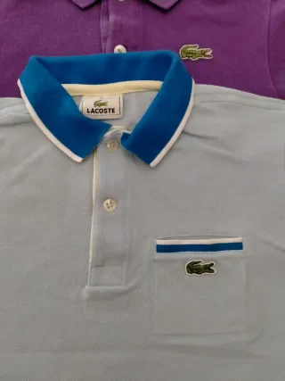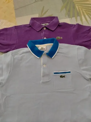 Lotto composto da due polo originali Lacoste per bambino. Polo viola con logo coccodrillo. Polo azzurra con taschino e logo coccodrillo, bordi blu e bianchi. Usate pochissimo.