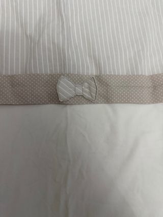 Set completo per lettino composto da copertina, cappello e fodera. - Copertina a righe bianche e grigie. - Dettaglio con fiocco. - Fodera bianca.