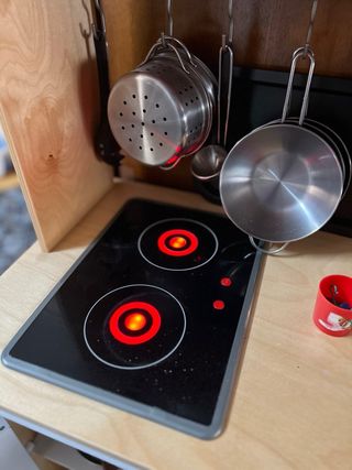 A mia figlia piaceva giocare a fare la cuoca con questa piccola cucina in legno di Ikea. Le luci dei fuochi funzionano con due intensità. È ben curata, anche se ha alcune adesivi su un lato. - Piano cottura con vetroceramica. - Lavandino con rubinetto. - Ganci per utensili. - Forno/microonde. - Armadi inferiori.