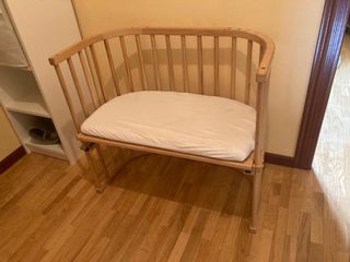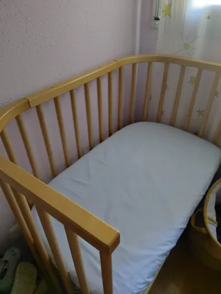 Culla colecho Babybay in legno di faggio. Usato, ma in ottime condizioni. Il legno non presenta macchie né danni. Ha una piccola crepa visibile nell'ultima foto. È sempre stata presente e non influisce sul funzionamento. Include: 4 ruote, barriera di sicurezza e pezzo con cinghie per fissare la culla al letto. Non include il materasso.