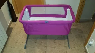 Culla adiacente Chicco Next2me in colore viola. Struttura regolabile in altezza. Ideale per tenere il bambino vicino durante la notte. - Lati in rete traspirante. - Include materasso. Marca: Chicco.