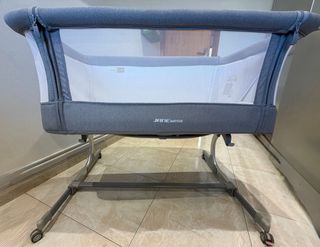 Culla con letto Babyside del marchio Jane. Con un lato apribile e altezza regolabile per il letto. Lati in rete traspirante. Struttura in metallo. Ruote per facilitare il movimento. Fino a 6 mesi. Include materasso e piumino. In buone condizioni.