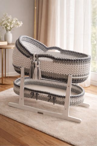 Culla realizzata all'uncinetto, perfetta per accogliere il tuo neonato. - Design a zigzag bicolore. - Manici per un facile trasporto. - Rifinitura sul bordo superiore.