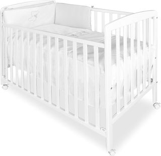 Culla per neonato in bianco, ideale per il riposo del neonato. Struttura in legno, ruote per facilitare il movimento, ringhiera su e giù per posizionare il bambino comodamente. Il materasso può essere posizionato a due diverse altezze a seconda dell'età del bambino.