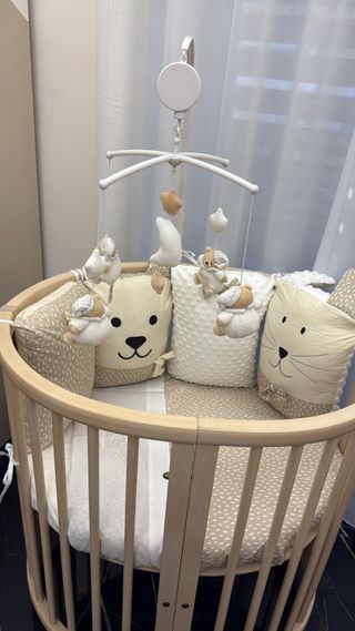 Culla Stokke Sleepi in legno di faggio. Il suo design ovale si adatta a qualsiasi spazio. - Struttura in legno di faggio. - Materasso incluso marca Stokke Sleepi. - Protezione interna anti-urto marca Stokke Sleepi. - Ruote per facilitare il movimento (le ho, ma non le ho usate).