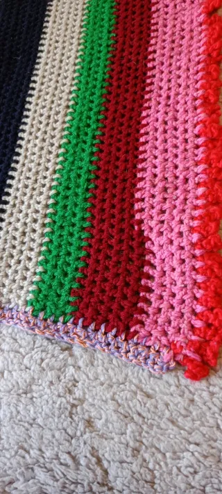 Copertina fatta a mano con un design a righe colorate. Misure 60x70 cm - Righe in diverse tonalità di rosa, rosso, verde, grigio, nero, giallo e blu. - Lavorazione all'uncinetto.