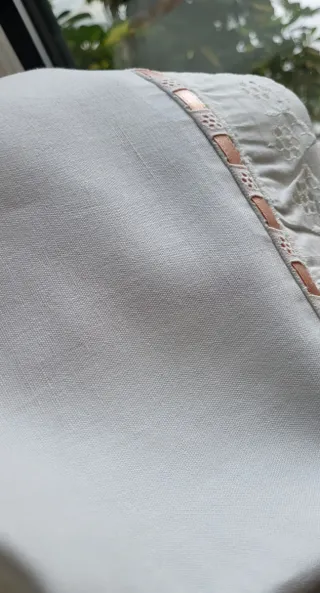 Vintage in tela di lino anni 60"realizzato sartoriale, nuovo mai utilizzato, bagnato prima di mettere in vendita, colore bianco panna ,prezzo già scontato per appassionati di tessuti originali di una volta e dargli la possibilità di essere utilizzato. - Misure: 118 x 89 cm. - Bordatura in pizzo bianco con nastro rosa. - Piccolo fiocco decorativo con fiorellino.