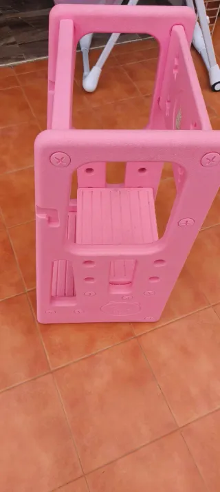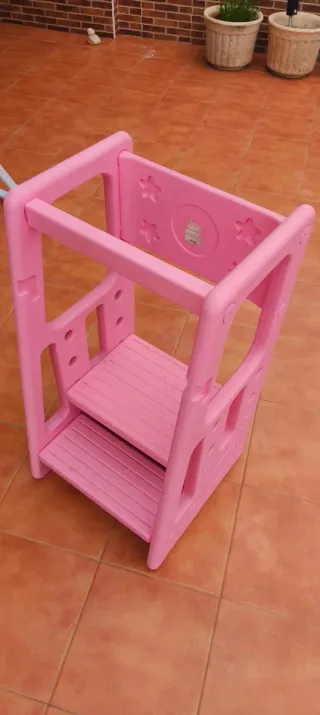 Torre di apprendimento Homcom in colore rosa, ideale per i più piccoli per raggiungere superfici. - Struttura di plastica resistente. - Due gradini per salire. - Design con stelle e un piccolo disegno nella parte superiore.